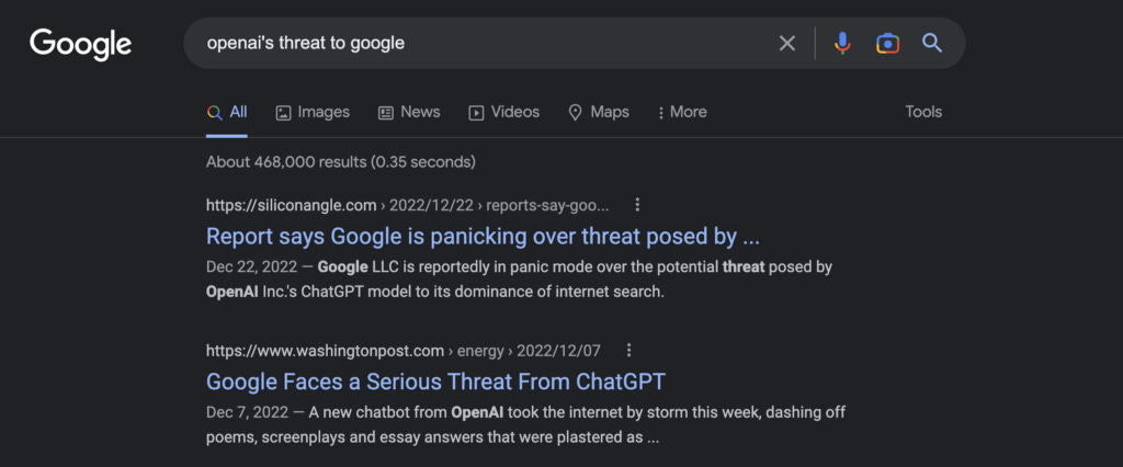 Much like DoorDash, ChatGPT dramatically expands the atomic unit of supply. Whereas Google is constrained to serving results of content already written by a human, ChatGPT doesn’t have that limitation. Its model creates content on demand. Moving forward, it’s easy to imagine a world where ChatGPT or another LLM-driven interface could even include links to other webpages as results, thus forming a superset of LLM + human generated results.